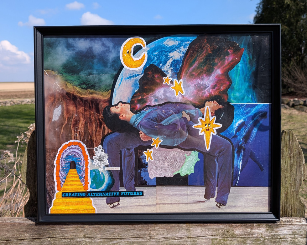 Water based Pens and micron pen on paper, magazine clippings, mod podge, on cardboard. 20 x 16"